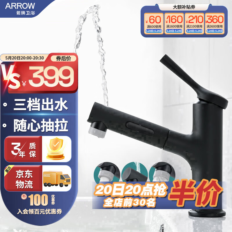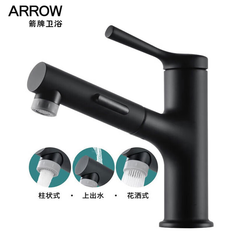 箭牌(ARROW)黑色面盆水龙头冷热洗脸盆水龙头卫生间抽拉式水龙头AE4175MA价格:369.00元!