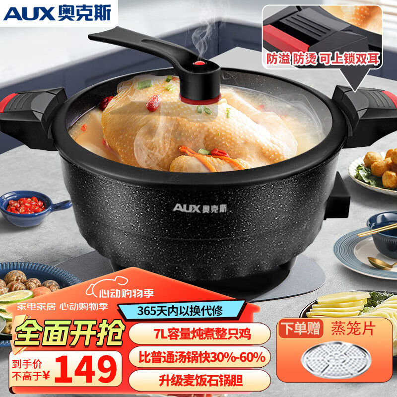 奥克斯(AUX)电火锅 微压锅 电炒锅 麦饭石家用电热锅 多功能电子微压锅不粘煲汤锅 Y32E 7L 配蒸片价格:149.00元!