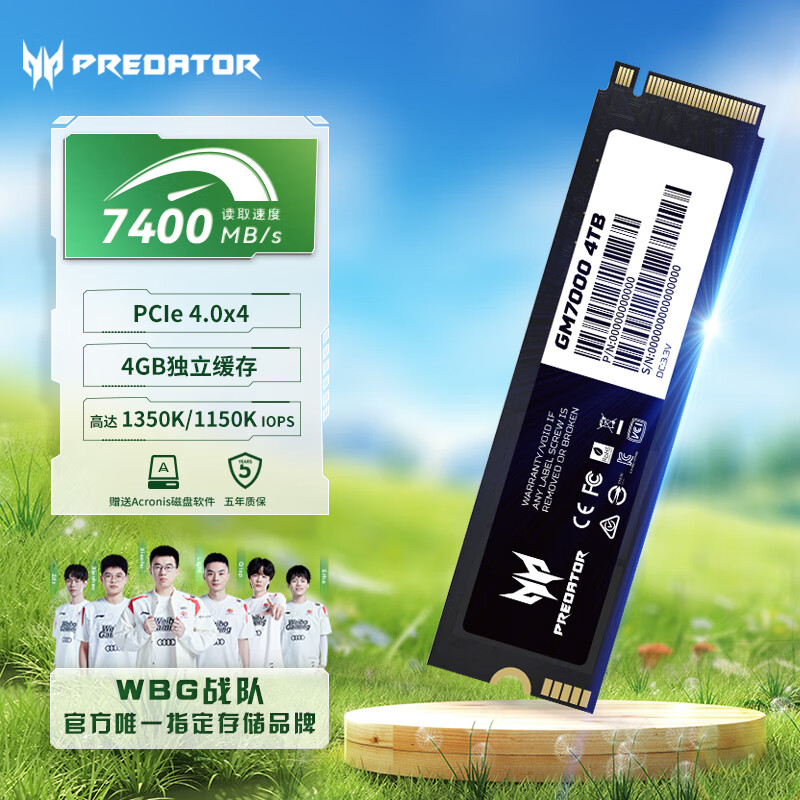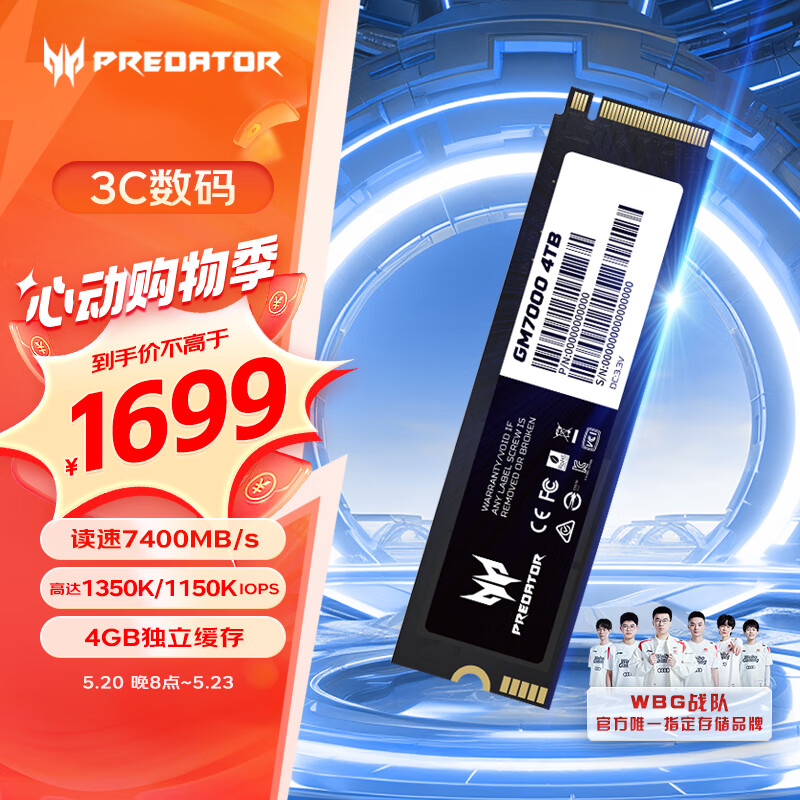 宏碁掠夺者(PREDATOR)4TB SSD固态硬盘 M.2接口(NVMe协议) GM7000系列|NVMe PCIe 4.0读速7400MB/s AI电脑存储配件价格:1699.00元!