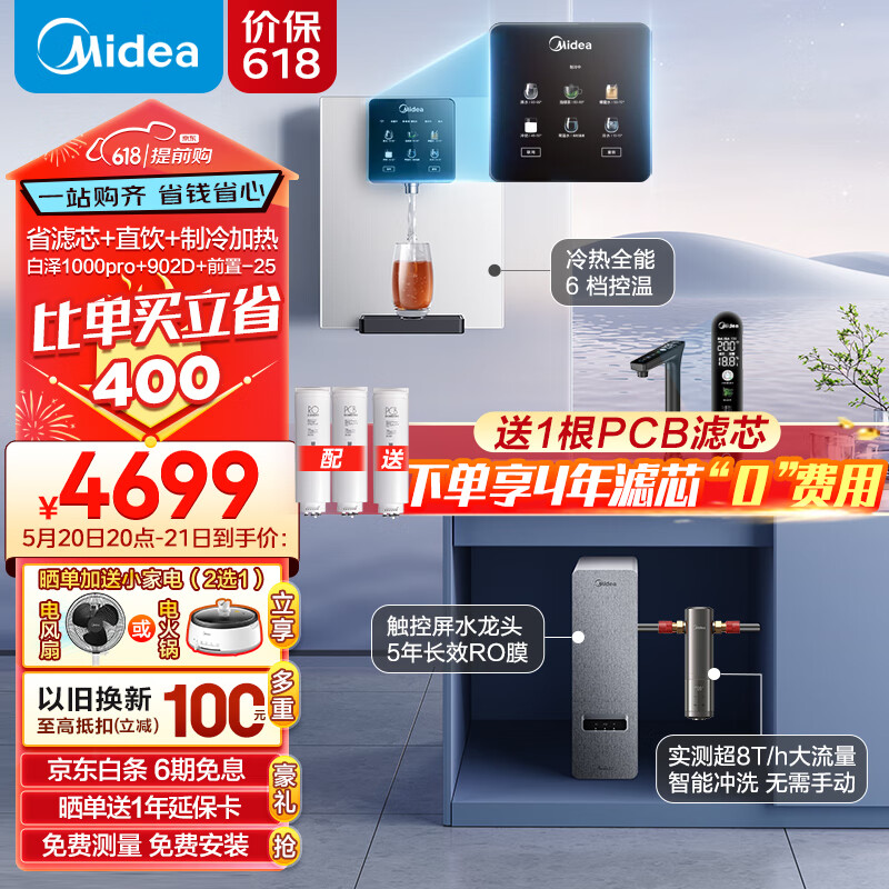 美的(Midea)省芯直饮冷热净水器套装【白泽1000pro+管线机902D+前置25pro】反渗透 家用壁挂式加热一体净饮机价格:4699.00元!