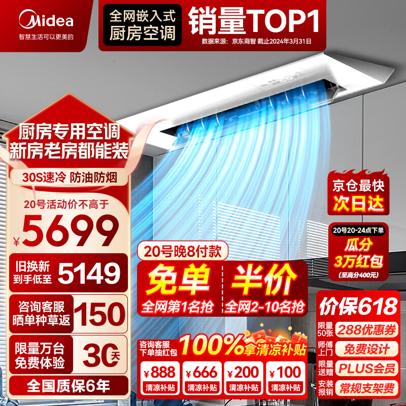 美的(Midea)小凉方 厨房空调 专用嵌入式 一级能效变频1.5匹 家用集成吊顶制冷CKF-35FW/BN1Y-FG100【极地白】价格:5699.00元!