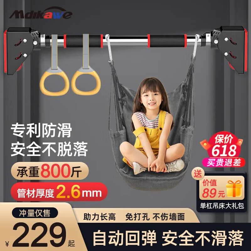 曼迪卡威(Mdikawe)单杠引体向上器成人家用儿童室内单杆门框免打孔健身器材秋千吊床价格:229.00元!