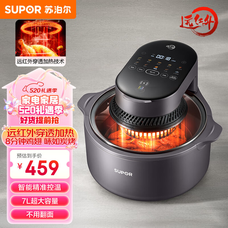 苏泊尔(SUPOR) 7L远红外空气炸锅大容量不用翻面可视家用可拆洗无油低脂不粘空气加热智能触控款KD70YQ855 7L价格:459.00元!