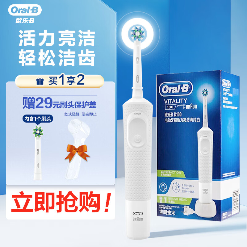 欧乐B电动牙刷成人 圆头牙刷自动声波旋转震动充电式(含刷头*1)日常清洁 清纯白D100博朗精工价格:189.00元!