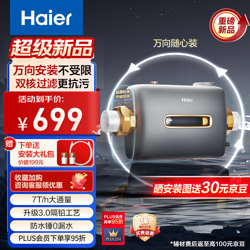 海尔前置过滤器万向安装7T大通量过滤器净水器家用40微米双滤网过滤器 小横星 HQZ60-HFAW12价格:699.00元!