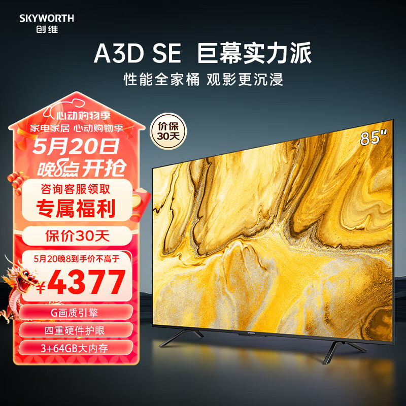 创维85英寸巨幕实力派85A3D SE 4K超高清平板电视机 G画质引擎3+64GB 四重硬件护眼 远场语音 85英寸价格:4477.00元!