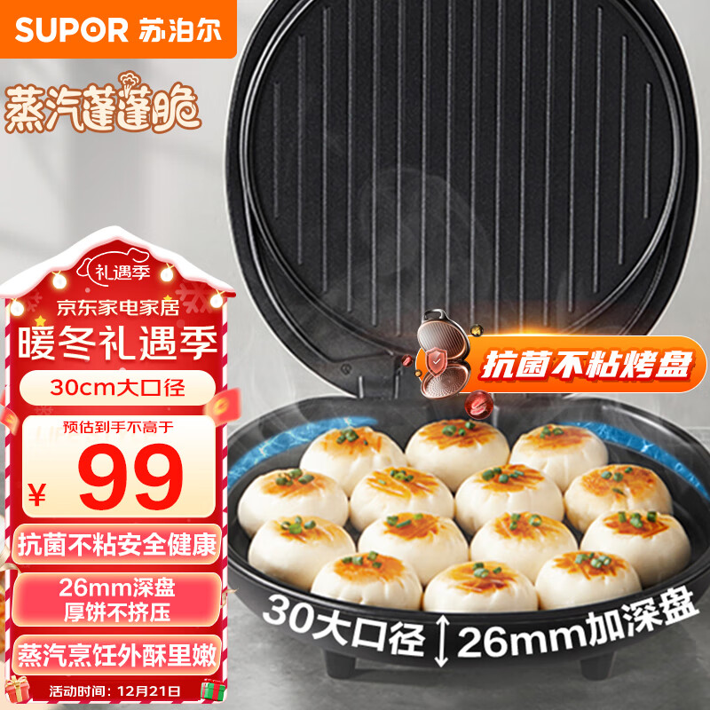 苏泊尔(SUPOR)电饼铛家用 电饼档 煎饼锅 煎烤机烙饼锅三明治机26mm加深 早餐机 升级蒸汽烤盘JJ30A648-Q价格:99.00元!