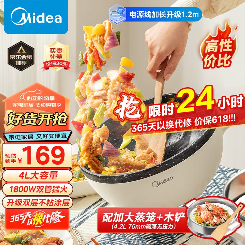 美的(Midea)电炒锅 电火锅 电蒸锅 电煮锅家用多功能大功率一体锅 炒菜锅4L电热锅 HGE2811B 配蒸笼价格:169.00元!
