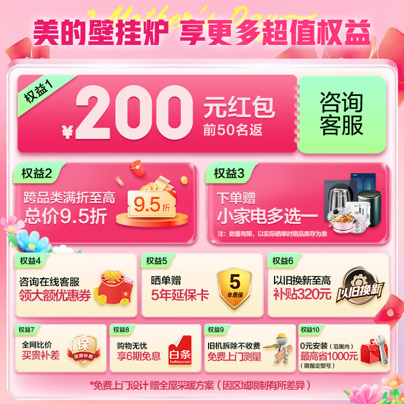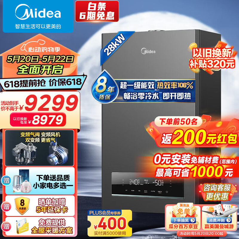 美的(Midea)双变频省气 一级能效 冷凝式增压零冷水燃气壁挂炉 天然气供暖 地暖采暖锅炉 LL1PBD28-R53 PRO价格:9799.00元!