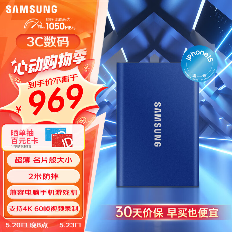 三星(SAMSUNG) 1TB Type-c USB 3.2 移动固态硬盘(PSSD) T7 蓝色 NVMe传输速度1050MB/s 超薄时尚价格:969.00元!