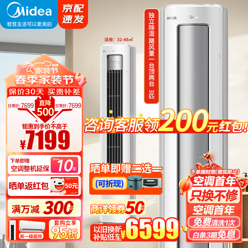 美的(Midea)空调 3匹 静优风 新一级能效 变频冷暖 除湿 空调立式 客厅空调立式柜机 [KFR-72LW/N8HY1-1]价格:7199.00元!