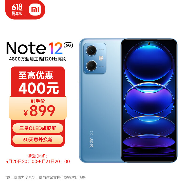 小米(MI)Redmi Note12 5G 120Hz OLED屏幕 骁龙4移动平台 5000mAh长续航 8GB+256GB时光蓝 小米红米价格:899.00元!
