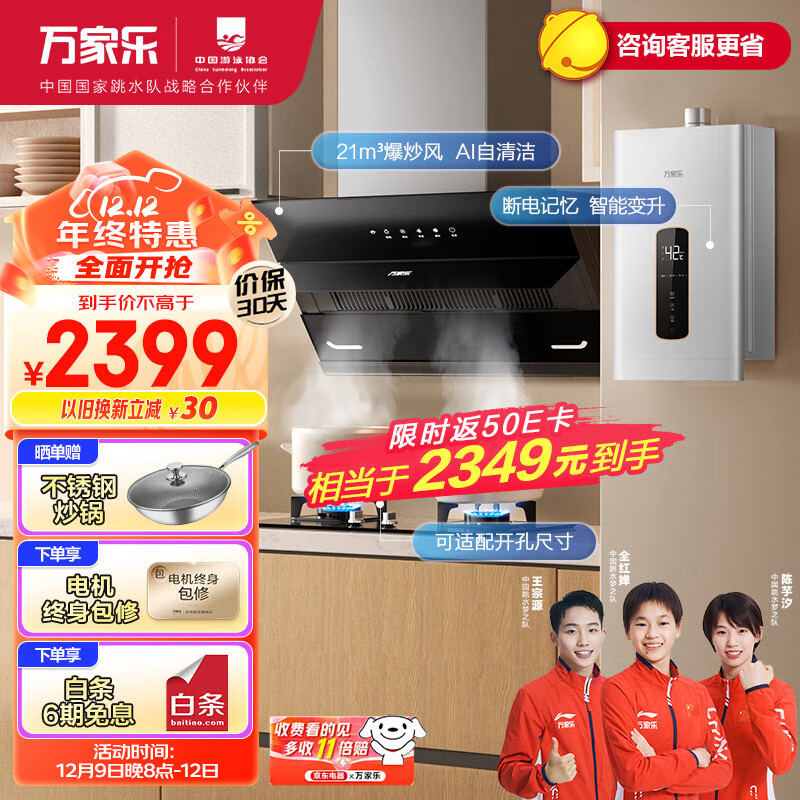 万家乐烟灶热水器三件套 21立方挥手烟灶套装13L智能变升燃气热水器多件套装AJ4+AY4C+13DP2天然气价格:2599.00元!