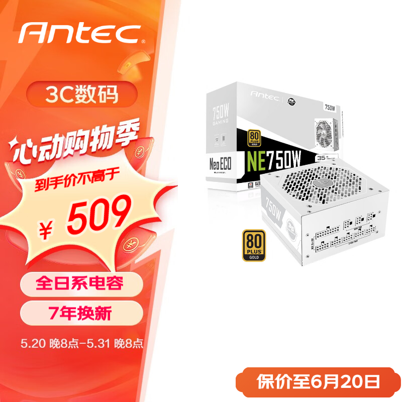 安钛克 Antec NE750金牌全模组 纯白/全日系电解电容/支持风扇启停/双8pin电脑主机电源750W价格:509.00元!