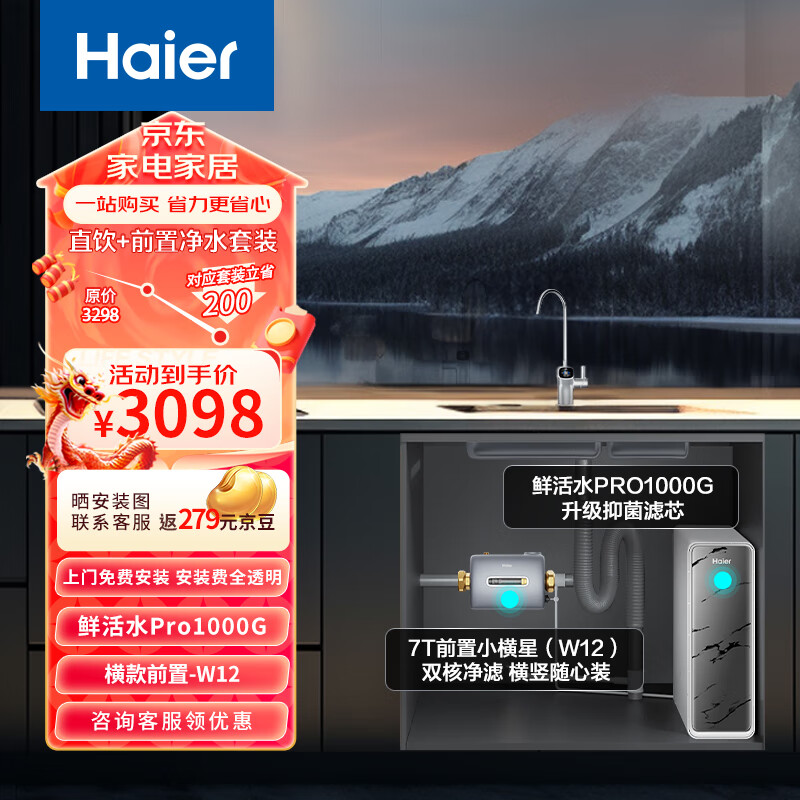 海尔(Haier)净水器1000G鲜活水pro家用净水机5年RO反渗透大通量净水器+前置过滤器HKC2400-R791D2U1+横置W12价格:3098.00元!