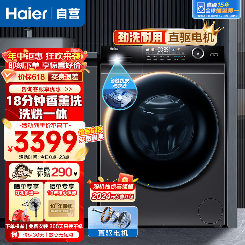 海尔(Haier)洗烘一体机全自动洗衣机滚筒10KG直驱变频智能投放微蒸汽空气洗香薰洗摇篮洗价格:3399.00元!