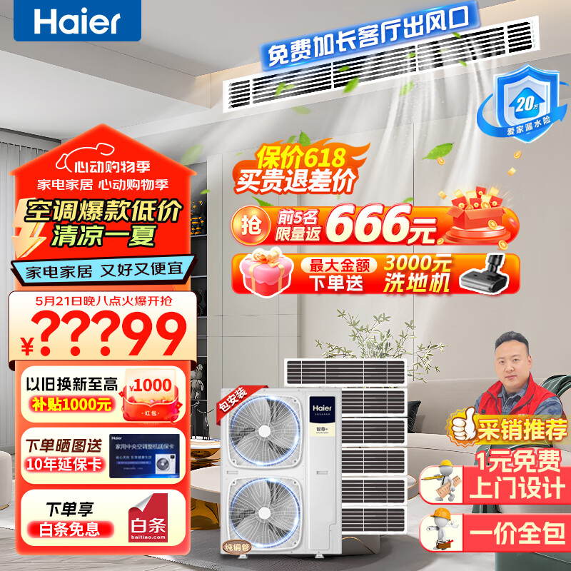 海尔(Haier)中央空调一拖六风管机7匹小多联一级能效全直流变频嵌入式智尊+ RFC180MXSAVA(G)价格:31999.00元!