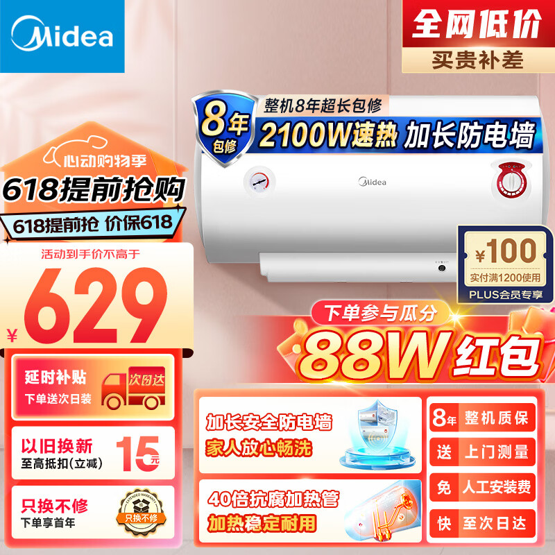 美的(Midea)热水器2100W速热耐用小体积升级加长防电墙全屋漏电预警60升储水式电热水器F60-21WA1价格:629.00元!