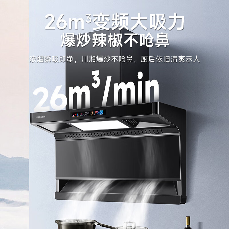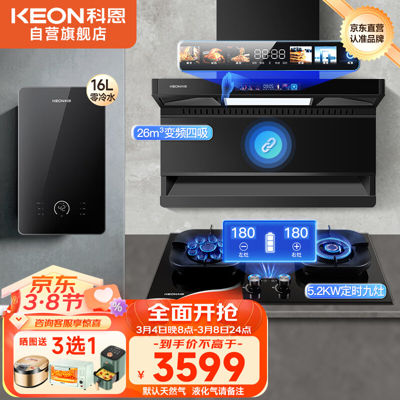 科恩(KEON)烟灶热套装家用26m3三腔四吸变频油烟机5.2kw鸳鸯九腔定时燃气灶具16L零冷水热水器三件套价格:3949.00元!