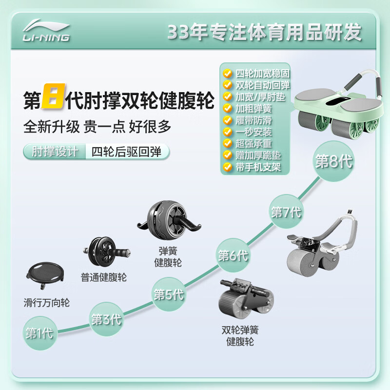 李宁(LI-NING)四轮健腹轮自动回弹家用肘撑腹肌轮男女卷腹两用平板支撑健身器材价格:172.00元!