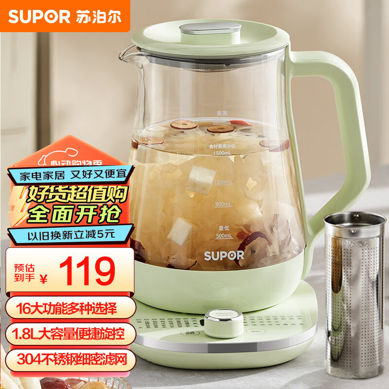 苏泊尔(SUPOR)1.8L大容量养生壶 煮茶器煮茶壶 304不锈钢电水壶 保温恒温花茶壶烧水壶 带滤网 SW-18YJ15B价格:119.00元!