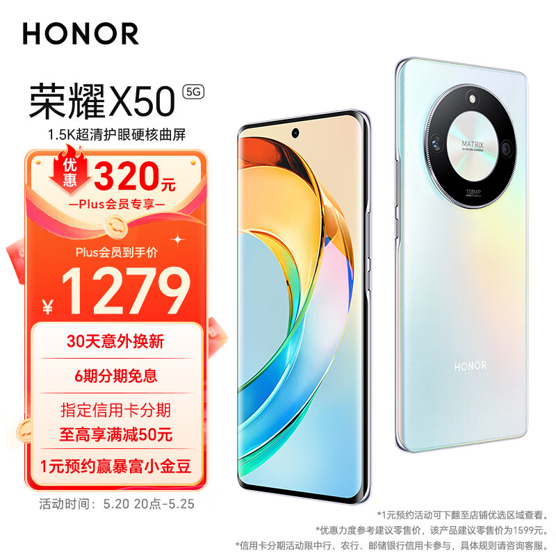 荣耀X50 代骁龙6芯片 1.5K超清护眼硬核曲屏 5800mAh超耐久大电池 5G手机 8GB+256GB 雨后初晴价格:1379.00元!
