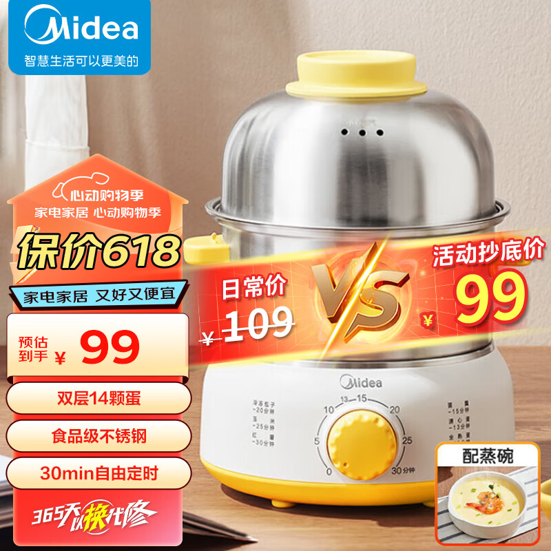 美的(Midea)煮蛋器蒸蛋器双层14颗蛋家用自动断电迷你鸡蛋羹神器防干烧不锈钢便携式MZ-ZDE1612价格:109.00元!