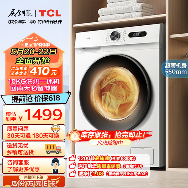 TCL 10KG变频滚筒L110除菌全自动滚筒洗烘一体超薄洗衣机除菌净螨 洗净比1.08 微蒸空气洗G100L110-HB价格:1499.00元!
