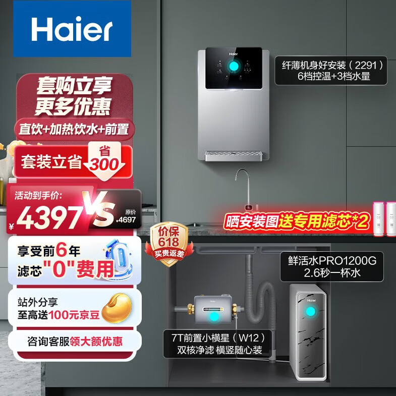 海尔(Haier)净水器1200G鲜活水 pro家用净水机6年RO净水器+前置过滤器+管线机HKC3000-R793D2U1+横置W12+R2291价格:4397.00元!