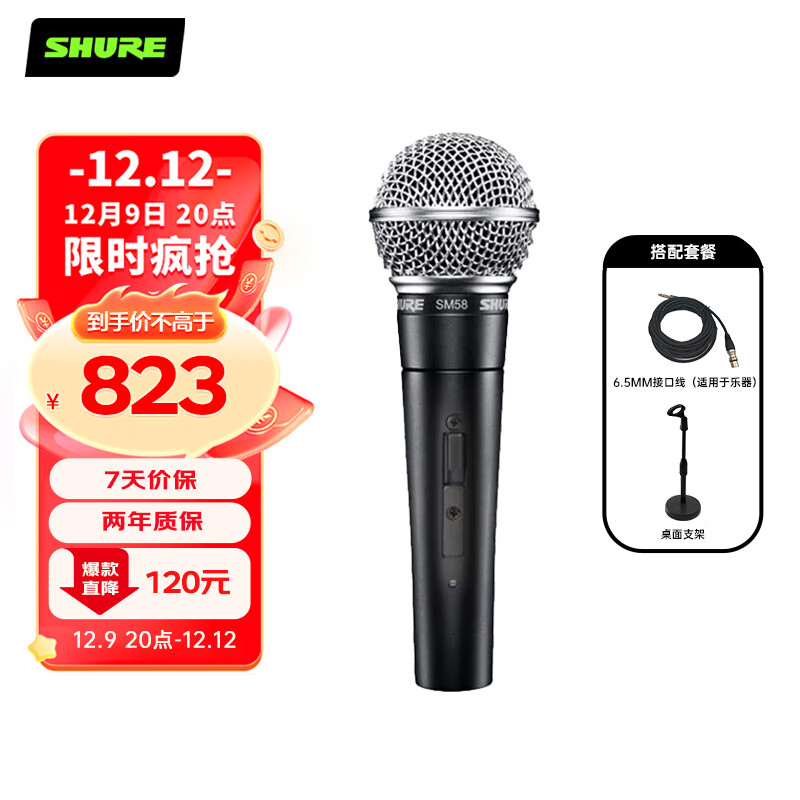舒尔 Shure SM58S-CHN直播舞台表演出家用K歌动圈有线话筒麦克风SM58S-CHN+6.5mm卡侬线+桌面支架价格:863.00元!