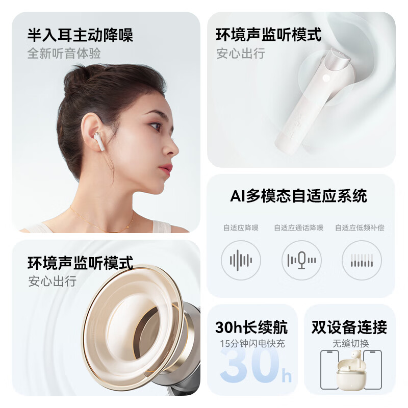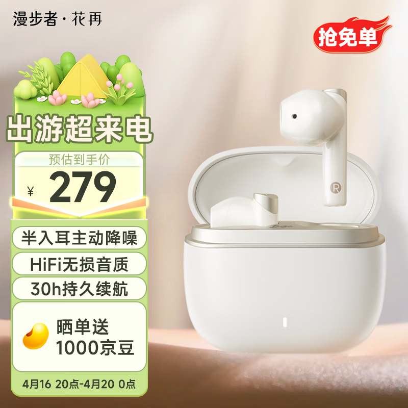 漫步者花再Magic ANC 真无线蓝牙耳机 半入耳主动降噪音乐运动游戏耳麦适用于安卓苹果华为小米手机 云岩白价格:299.00元!