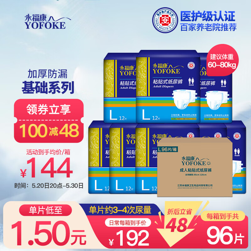 永福康 成人纸尿裤L96片(腰围85-120cm) 老人尿不湿 孕产妇粘贴式纸尿裤价格:192.00元!