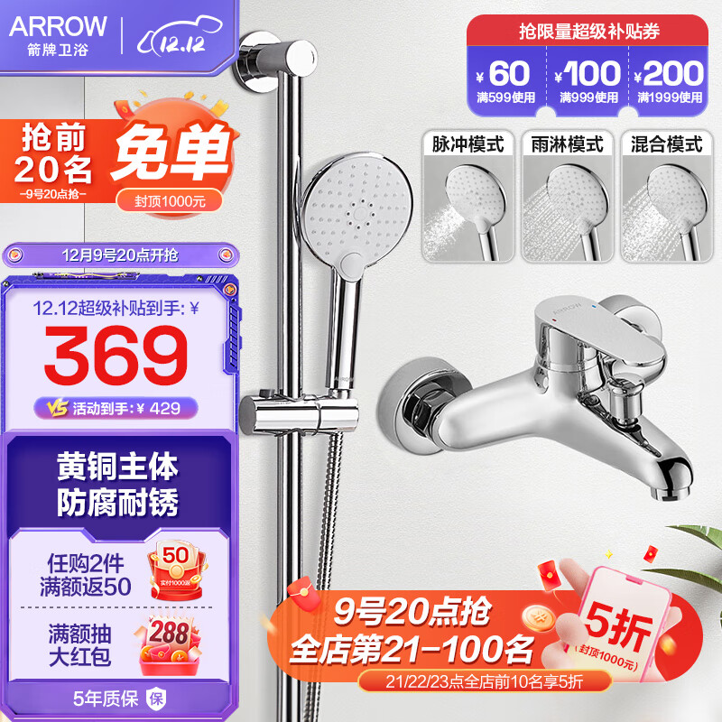 箭牌(ARROW)双功能淋浴花洒套装卫生间精铜淋浴器喷头沐浴莲蓬头淋雨冷热花洒 圆形双功能下出水花洒3201M价格:609.00元!