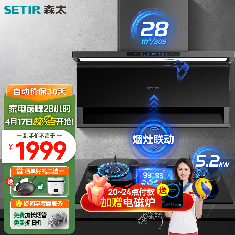 森太(SETIR)油烟机燃气灶套装 1100Pa变频超薄双吸抽油烟机烟灶联动家用定时灶烟灶两件套 BA92BL+TM81天然气价格:2299.00元!
