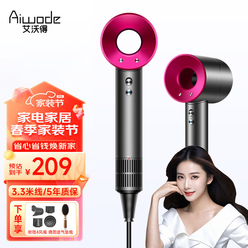 艾沃得(Ai wo de)吹风机家用新一代电吹风筒大功率高速吹风机1600W负离子大风力11万转速干低噪音便携无叶 玫红色3.3米线 【负离子发廊家用】四风嘴 普通装价格:198.55元!