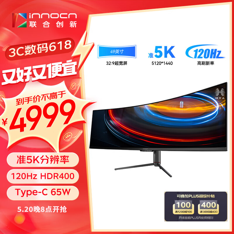 联合创新(Innocn)49英寸 准5K带鱼屏32:9 DQHD 120HZ HDR400 Type-C65W内置音箱HVA曲面电竞显示器 49C1R价格:4999.00元!