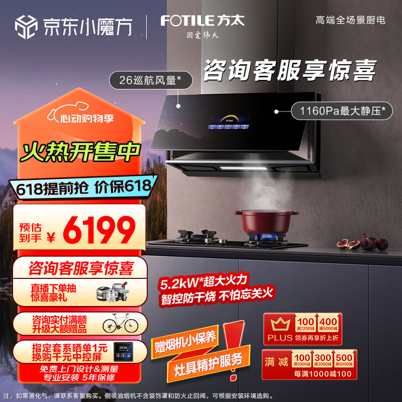 方太(FOTILE)抽吸油烟机灶具套装 侧吸式变频 26大风量 超薄近吸 烟灶联动 5.2kw防干烧 换装双灶P10.i+THK21B价格:6799.00元!