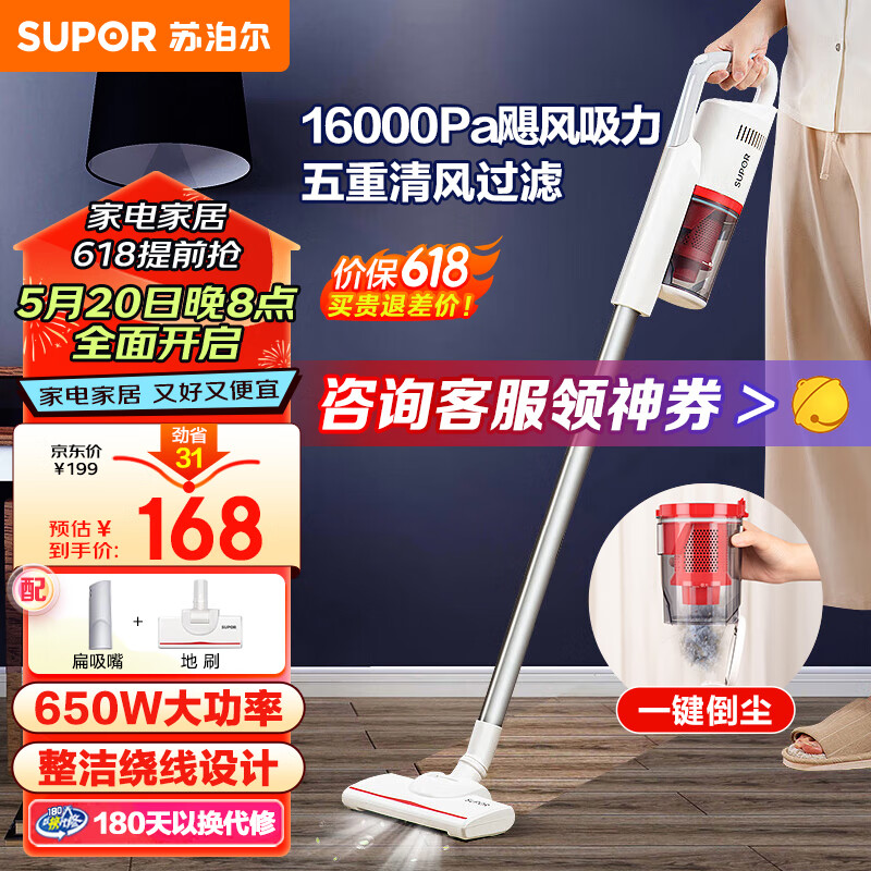苏泊尔(SUPOR)手持吸尘器家用随手吸小型大吸力二合一除尘机宠物家庭适用VCS60A-C2价格:168.00元!