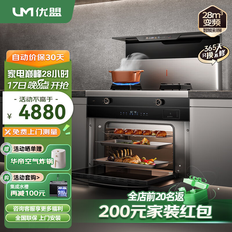 优盟(UM)集成灶蒸烤一体式环保灶家用变频大吸力侧吸下排抽油烟机燃气灶具蒸烤箱一体机自动清洗天然气价格:5380.00元!