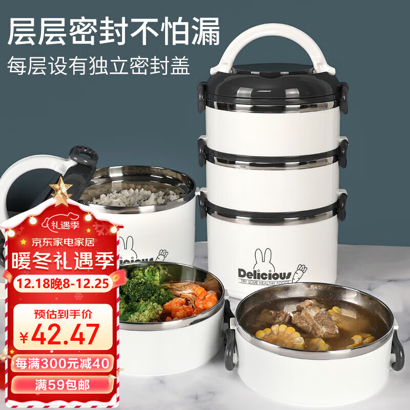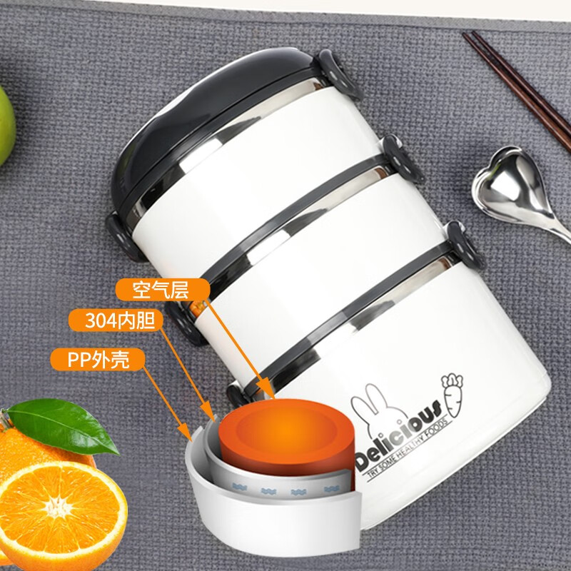 贝瑟斯 304不锈钢三层饭盒 学生保温餐盒大容量上班族便当分层饭桶2.4L价格:49.00元!