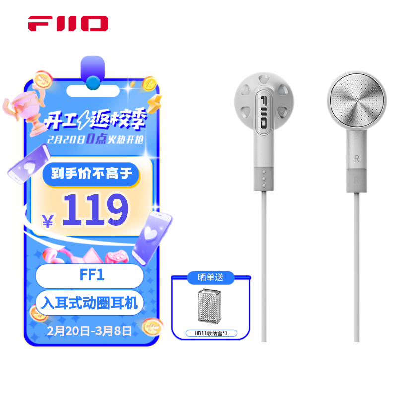 飞傲(FiiO)FF1镀铍振膜动圈金属平头耳机0.78双针可换耳机线带麦线控HIFI耳塞 银色价格:149.00元!