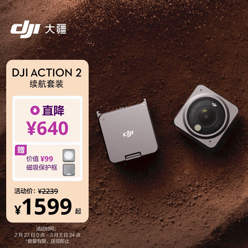 大疆 DJI Action 2 续航套装 灵眸运动相机 小型手持防水vlog相机 骑行摄像机+ 随心换 1 年版实体卡价格:1768.00元!