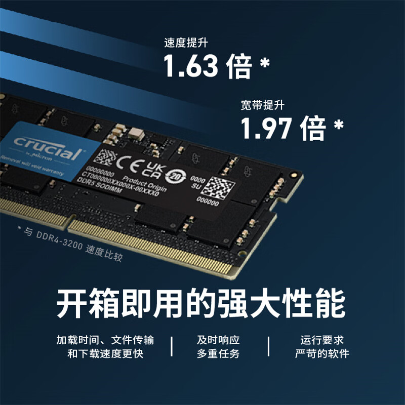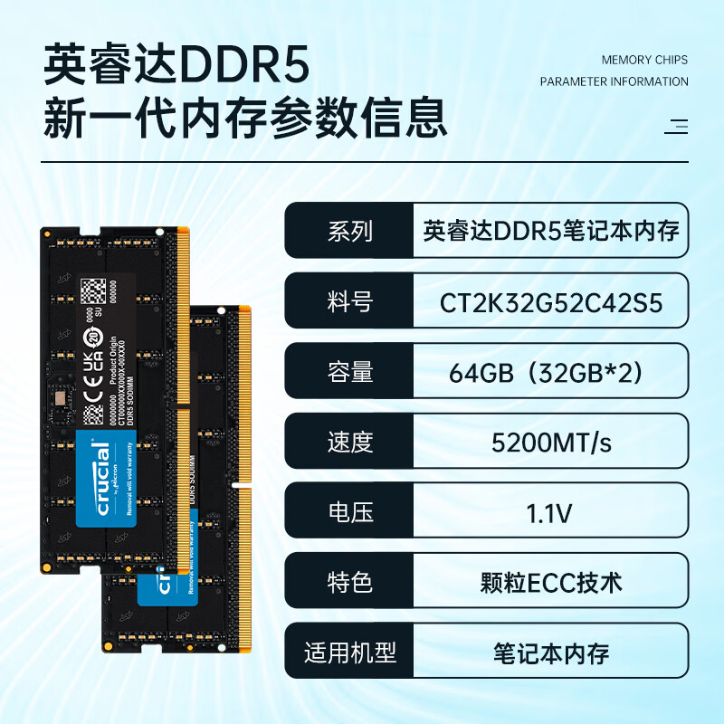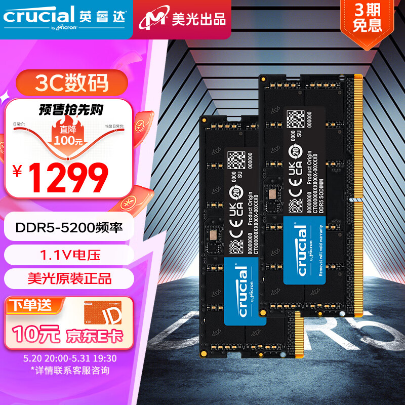 Crucial英睿达 64GB(32GB×2)套装 DDR5 5200频率 笔记本内存条 美光原厂颗粒 助力AI价格:1299.00元!