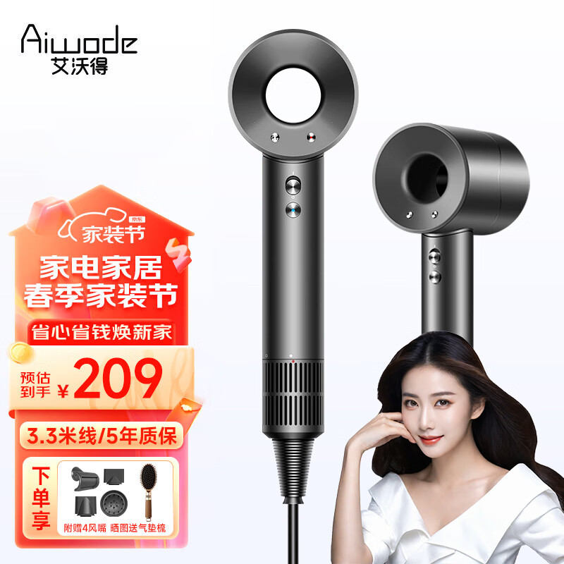 艾沃得(Ai wo de)吹风机家用新一代电吹风筒大功率高速吹风机1600W负离子大风力11万转速干低噪音便携无叶 酷黑色3.3米线 【负离子发廊家用】四风嘴价格:209.00元!