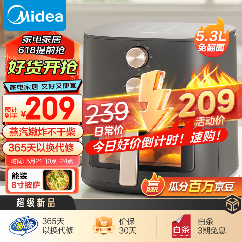 美的(Midea)空气炸锅 免翻面 可视嫩烤 家用大容量 5.3L 炸烤箱一体 精准控温 不沾易洗 不用翻面 KZE538J5价格:239.00元!