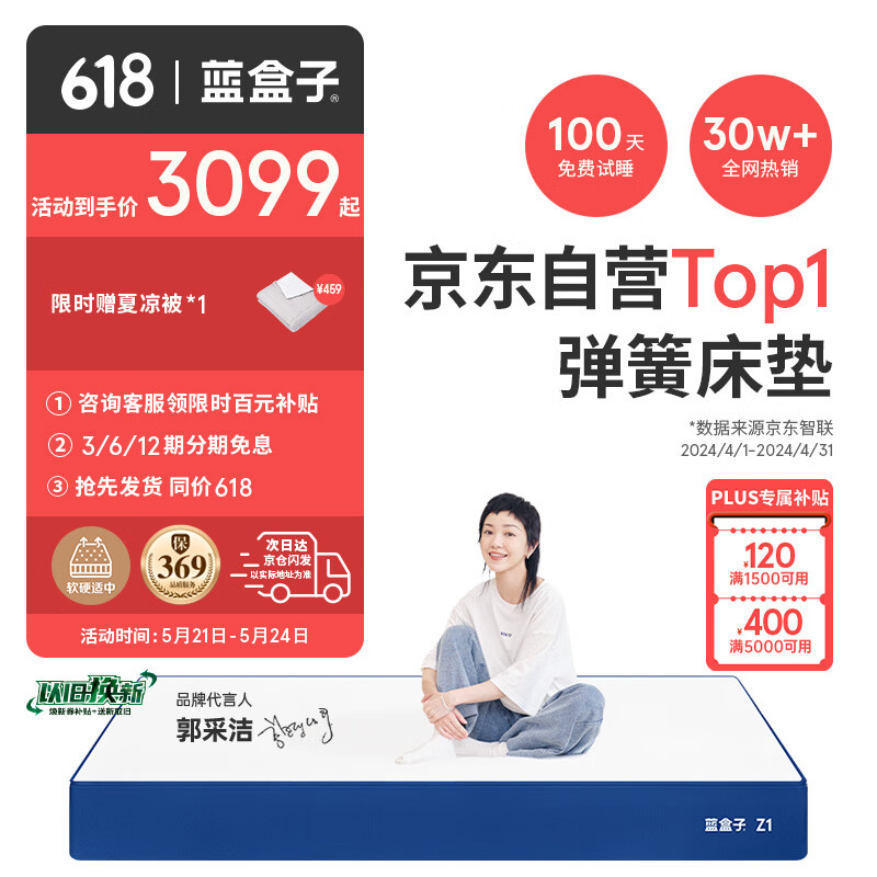 蓝盒子Z1博主推荐记忆棉弹簧床垫双人家用五星酒店1.8x2米价格:4389.00元!