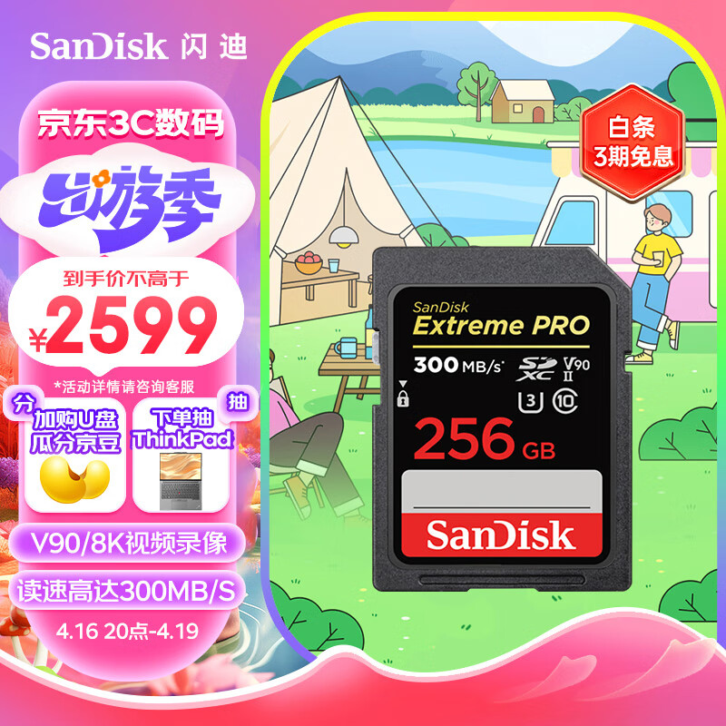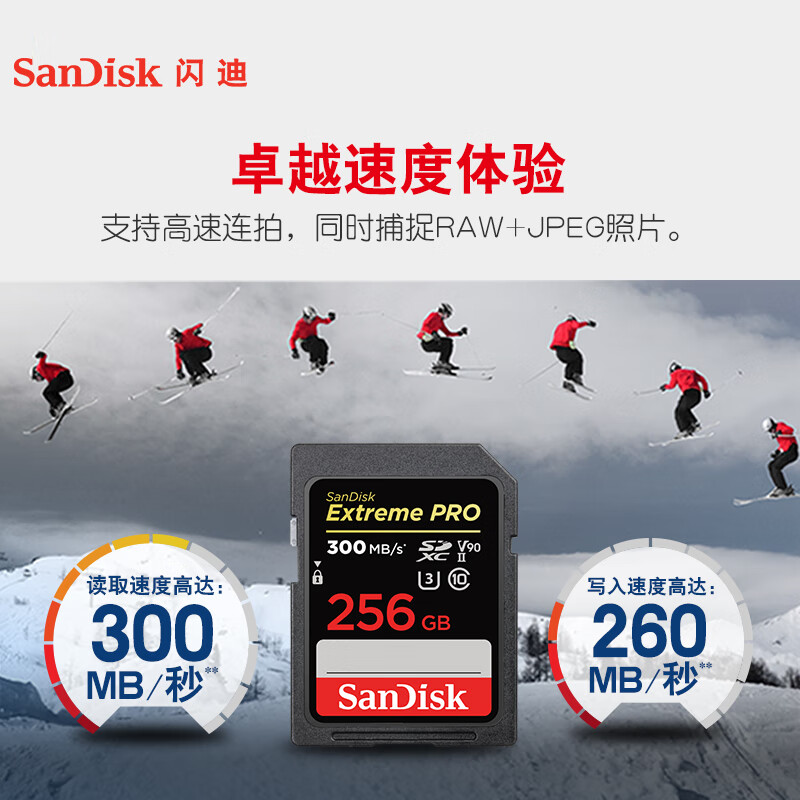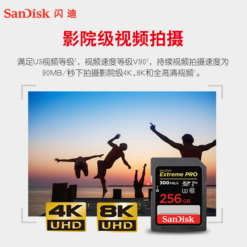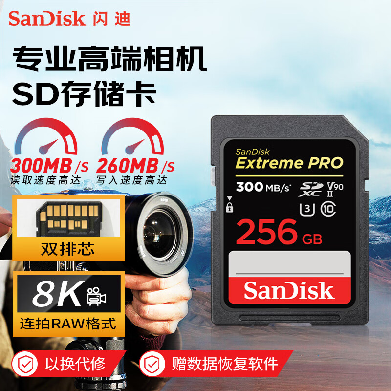 闪迪(SanDisk)256GB V90 SD内存卡U3 C10 8K/4K高速相机存储卡 读速300MB/s 写速260MB/s 影院级高清拍摄价格:2599.00元!