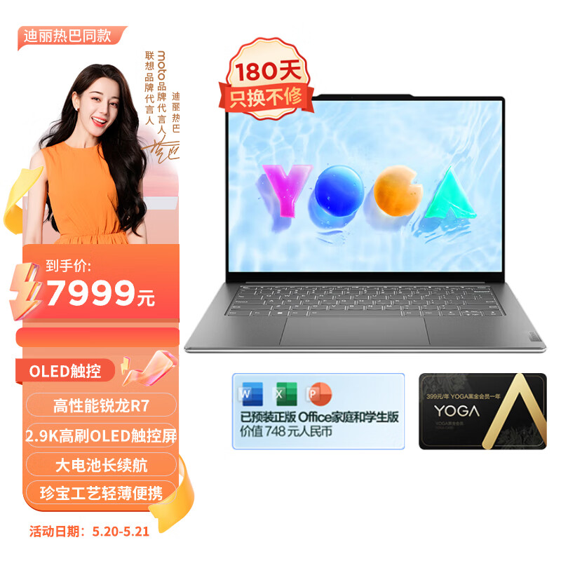 联想笔记本电脑YOGA Air14s轻盈本 高性能锐龙R7 14.5英寸轻薄本 16G 1T 2.9K OLED高刷屏银商务设计师价格:7999.00元!