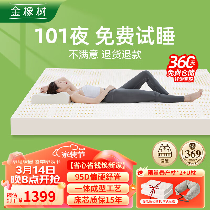 金橡树泰国乳胶原液进口双人床垫 1.8米x2米 92%乳胶 泰舒95D 含内外套价格:1399.00元!