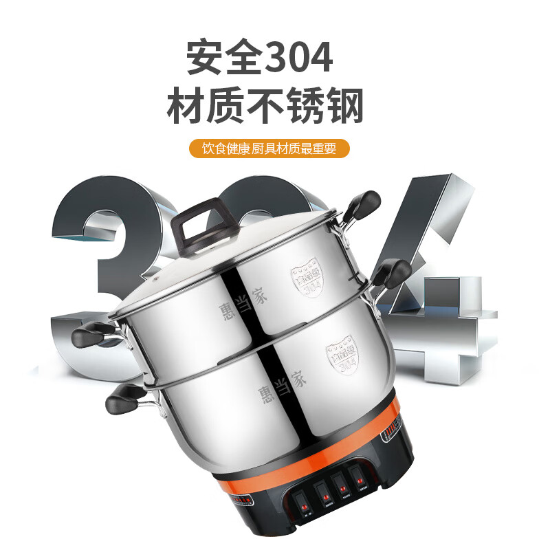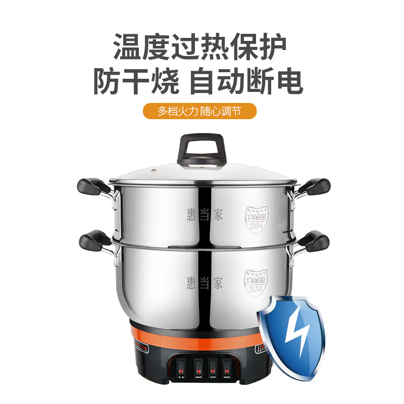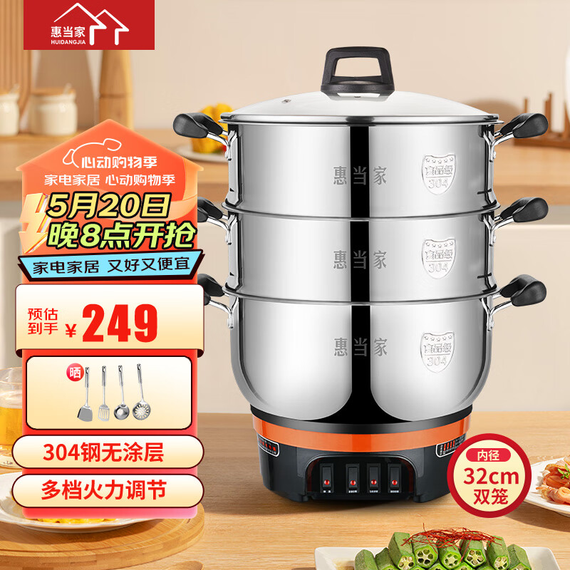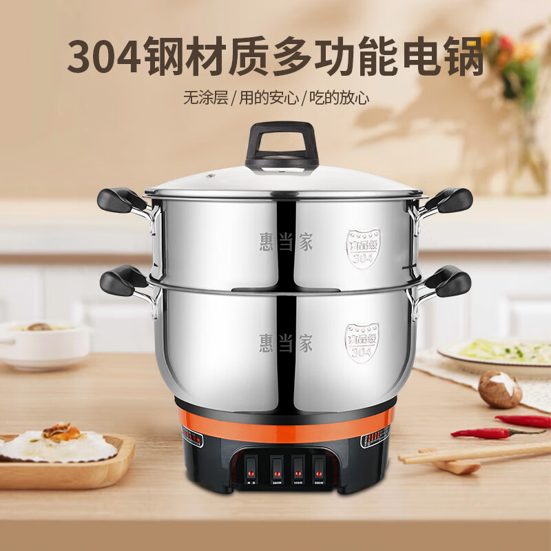 惠当家(Hui Dang Jia)电锅多功能电热锅电炒锅家用电蒸锅一体电煮锅加厚304不锈钢电火锅 32CM双蒸格【全304钢4-6人】 5L价格:249.00元!
